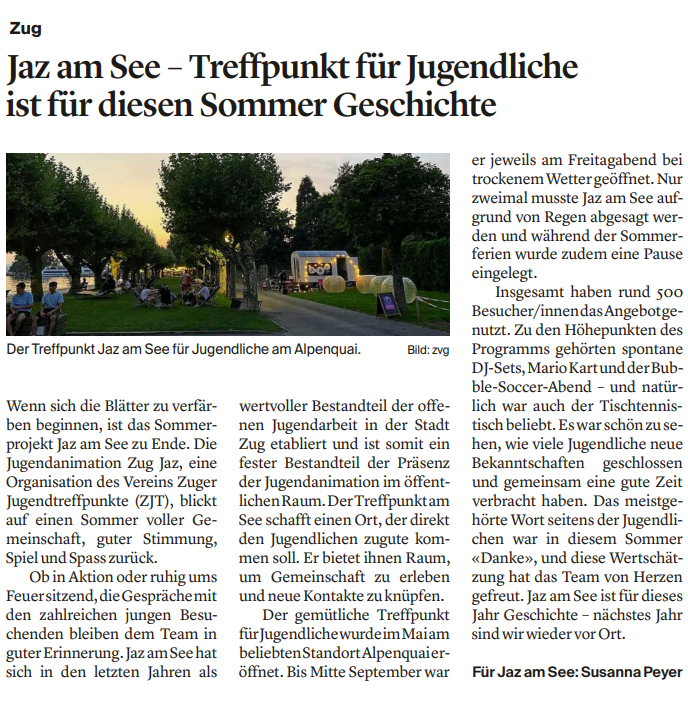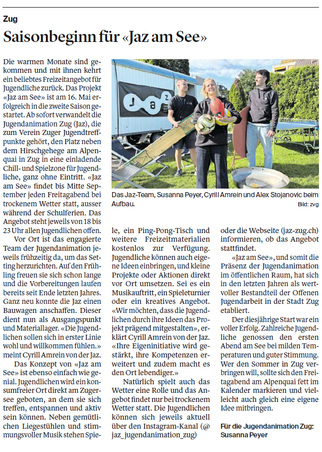 24. September 2025«Zuger Zeitung» Jaz am See – Entspannter Treffpunkt für Jugendliche am See