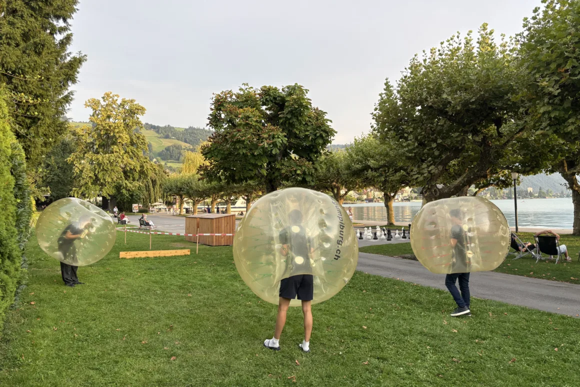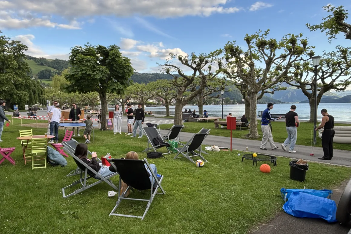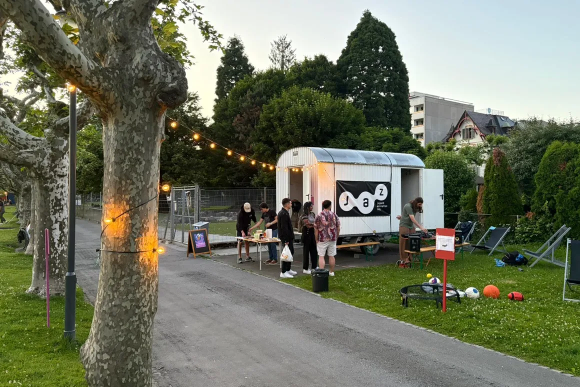 Ob du mit deinen Kolleg:innen Fussball, Volleyball, Frisbee, Pingpong oder viele andere Spiele ausprobieren möchtet, oder einfach entspannt in den Liegestühlen verweilen wollt: Das Jaz-Team ist immer vor Ort, und die Teilnahme ist kostenlos.