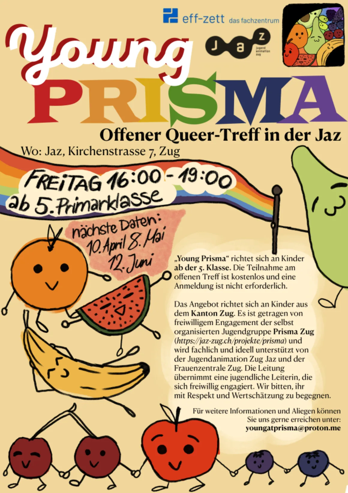 Die Jugendgruppe Young Prisma ist offen und autonom organisiert. Sie freuen sich jederzeit über neue Gesichter. Die Jaz begleitet und unterstützt die Gruppen im Hintergrund und ist bei den Treffen jeweils nicht vor Ort.